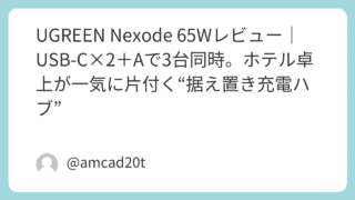 個人的おすすめ UGREEN Nexode 65Wレビュー|USB-C×2+Aで3台同時。ホテル卓上が一気に片付く“据え置き充電ハブ” バッテリーは足りているのに、充電口が足りない。遠征あるあるを解決するのがUGREEN Nexode 65W(3ポート)です。USB-C×2+USB-Aの同時3台充電に対応し、PC・カメラ用充電器・スマホといった異なる電力レンジを一括で面倒見... 2025.10.06 個人的おすすめ