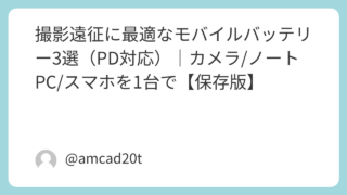 商品比較 撮影遠征に最適なモバイルバッテリー3選(PD対応)|カメラ/ノートPC/スマホを1台で【保存版】 撮影遠征の電源不安を解消。PD65W・約2万mAh・2〜3ポートの“現場で使える”モバイルバッテリー3選を厳選。PC編集向けの上位出力やケーブル選び、機内持込の目安も解説。 2025.09.15 商品比較