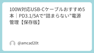 商品比較 100W対応USB-Cケーブルおすすめ5本|PD3.1/5Aで“詰まらない”電源管理【保存版】 撮影やPC充電で詰まらないためのUSB-Cケーブルを厳選。PD100W(5A)対応・eMarker内蔵・1.2m/2m/3mの長さ別で選び方とおすすめ5本を紹介。転送速度や耐久のポイントも解説。 2025.09.19 商品比較