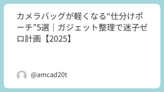 商品比較 カメラバッグが軽くなる“仕分けポーチ”5選|ガジェット整理で迷子ゼロ計画【2025】 レンズ・電源・ケーブルを素早く取り出せる“仕分けポーチ”を厳選。自立型・薄型・ボード型・防水・インナーの5タイプで、選び方と使い分けのコツ、撮影遠征のパッキング術を解説。 2025.09.20 商品比較