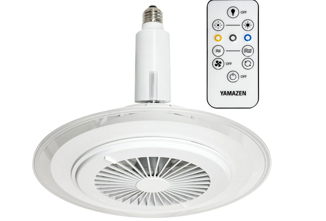 山善「導光板 FAN付き LEDライト(DFLC-100VE)」は、やさしい面発光の明かりに、天井付近の空気を回す内蔵ファンを組み合わせた多機能シーリング。風量5段階・逆回転・ライトとファンの個別運転に対応します。