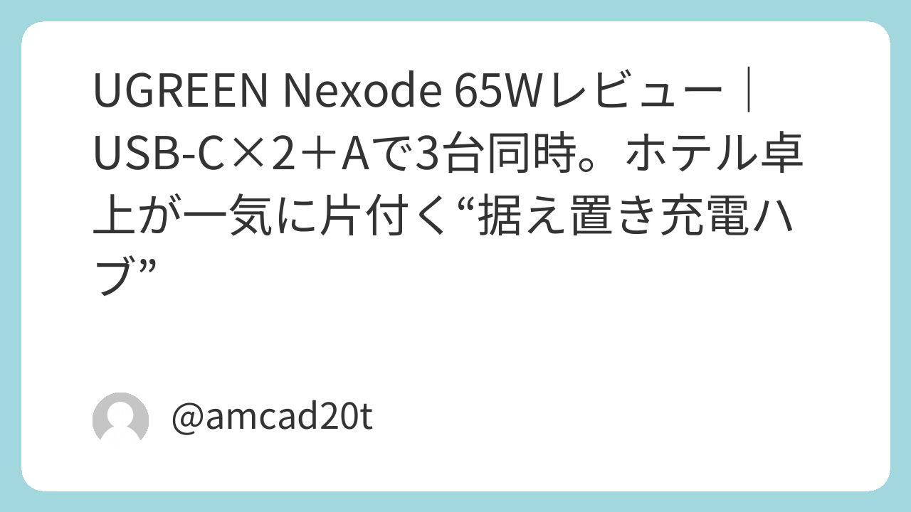 バッテリーは足りているのに、充電口が足りない。遠征あるあるを解決するのがUGREEN Nexode 65W(3ポート)です。USB-C×2+USB-Aの同時3台充電に対応し、PC・カメラ用充電器・スマホといった異なる電力レンジを一括で面倒見られます。プラグ収納で持ち運びやすく、据え置きの“充電ハブ”としてホテルの卓上に定位置を作ると、夜の仕込みが短時間で完結。